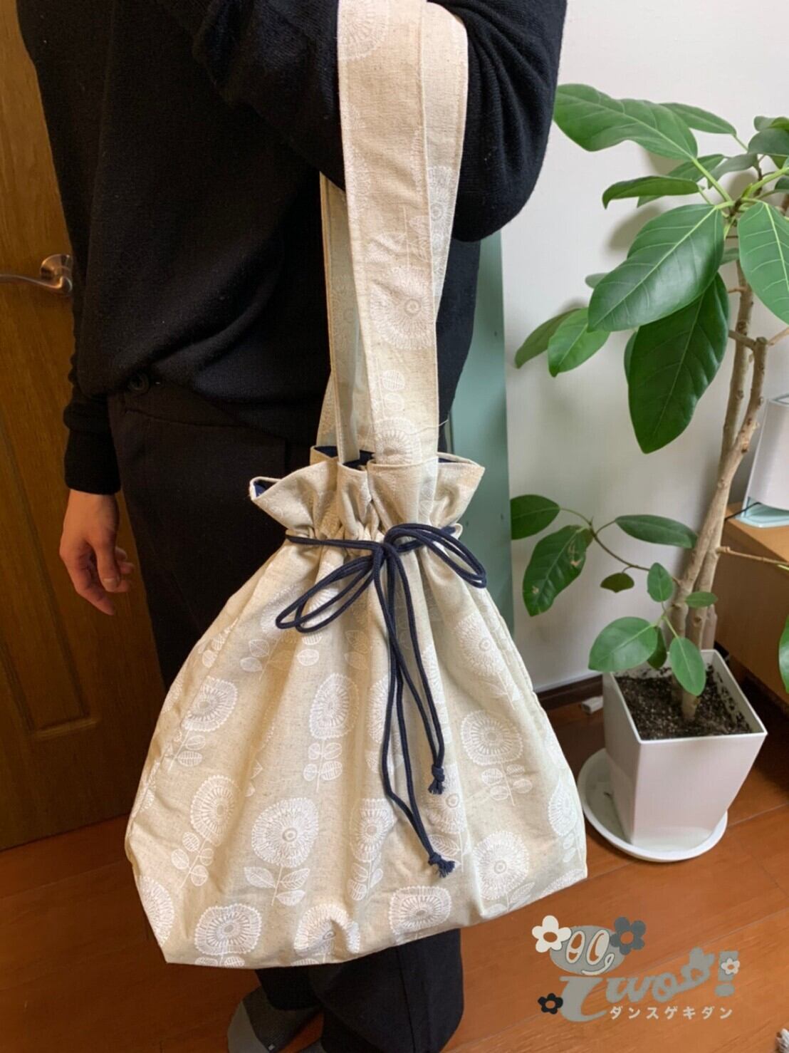 紐を絞ると形が可愛い巾着バッグです。